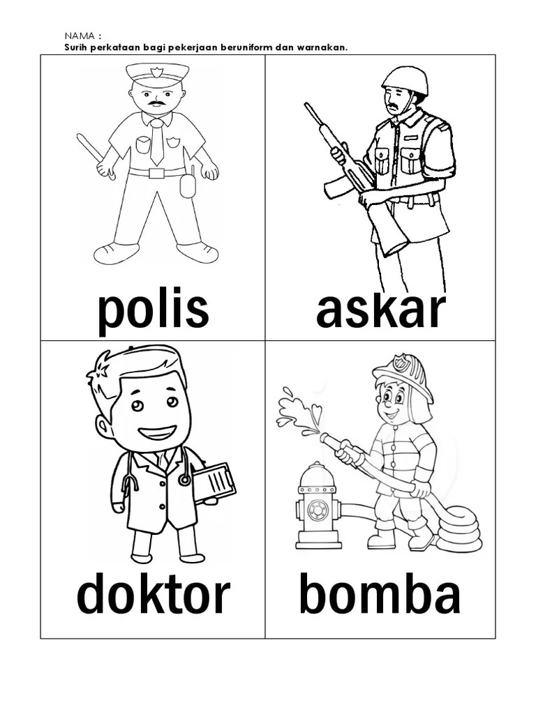 Nie ada sedikit lembaran kerja pekerjaan beruniform dari saya. Ibu bapa /penjaga membimbing murid dengan bertanya mengenai nama pekerjaan beruniform sekall lagi. Saya buat apa yang senang & mudah untuk . Terdapat beberapa lembaran kerja baru yang telah dimuat naik. Have yourself a merry little christmasmusician: Seterusnya, murid ditunjukkan lembaran aktiviti |. Lembaran kerja pra sekolah preschool lesson plans, preschool learning activities, kindergarten worksheets, fun. Prasekolah gambar mewarna tema pekerjaan tidak beruniform. Nampak macam sama setiap masa kan? Pekerjaan beruniform · tema pekerjaan beruniform (prasekolah) · operasi tambah prasekolah · uniform occupation for preschool. Urusan pentadbiran kelas prasekolah (a) membantu guru mendaftar . Padankan gambar dengan nama pekerjaan yang betul.